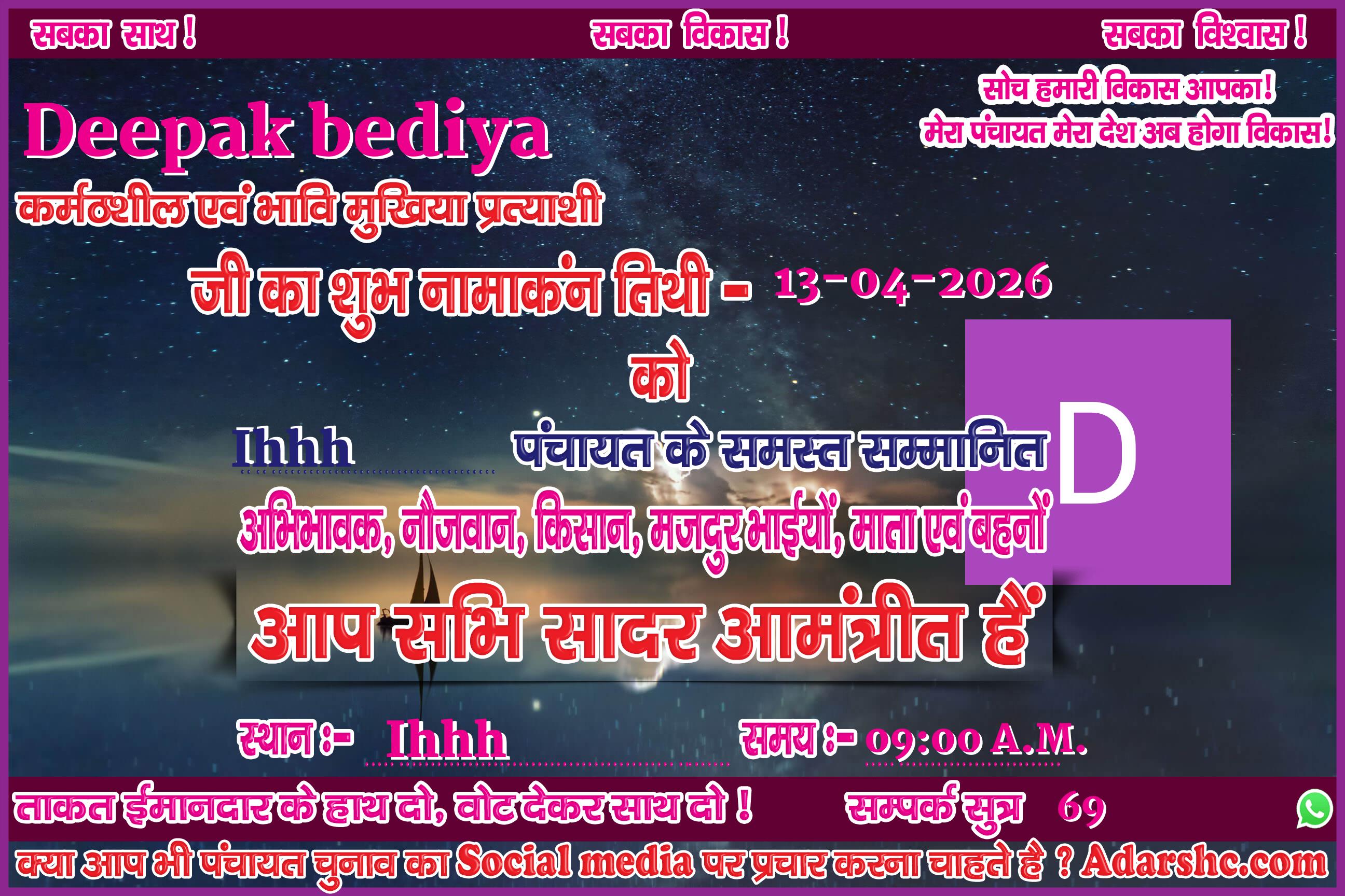 ♥ अगर आप भी पंचायत चुनाव में भाग लिये है ! तथा आप भी अपना ईस प्रकार से Social Media पर प्रचार कर अपने लोगों तक पहुँचना चाहते है, तो Sign up कर ID No. प्राप्त करे |