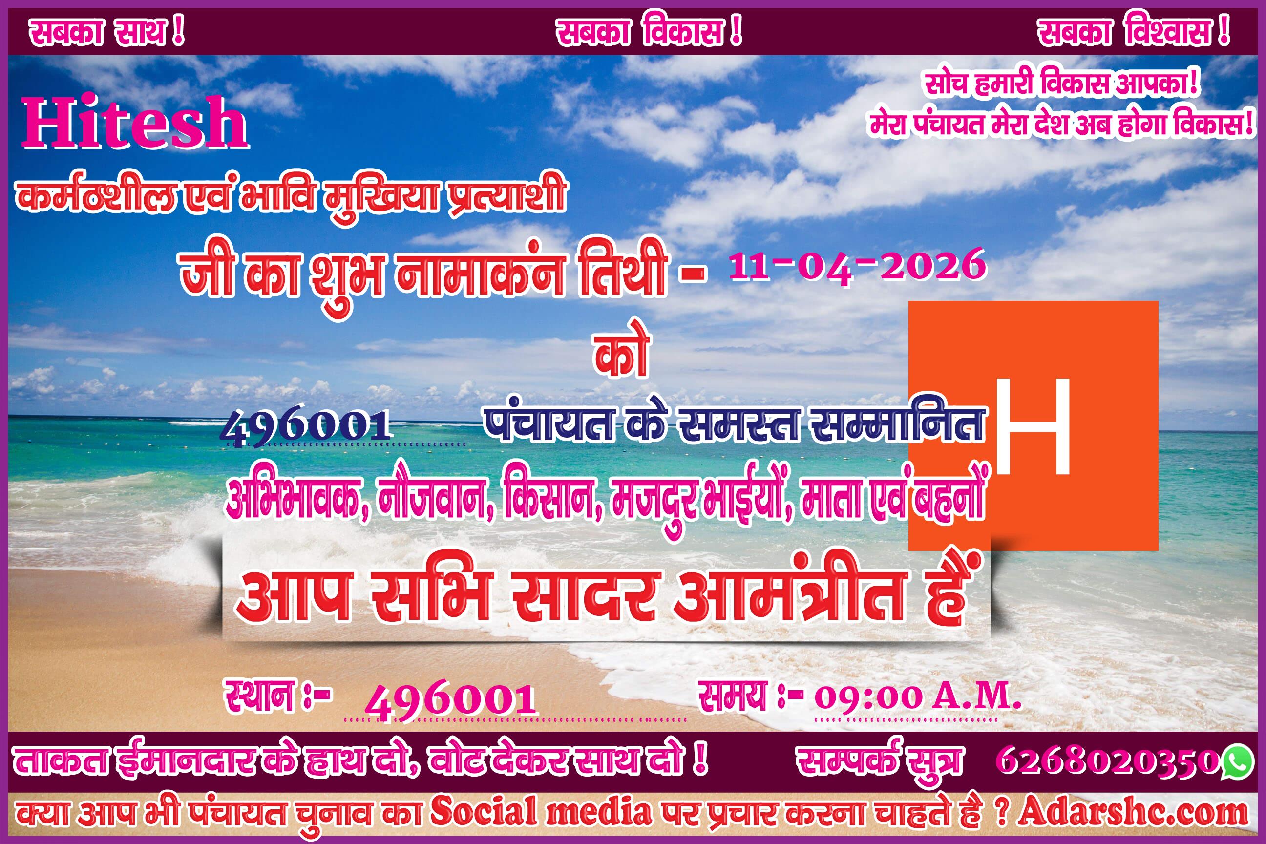 ♥ अगर आप भी पंचायत चुनाव में भाग लिये है ! तथा आप भी अपना ईस प्रकार से Social Media पर प्रचार कर अपने लोगों तक पहुँचना चाहते है, तो Sign up कर ID No. प्राप्त करे |