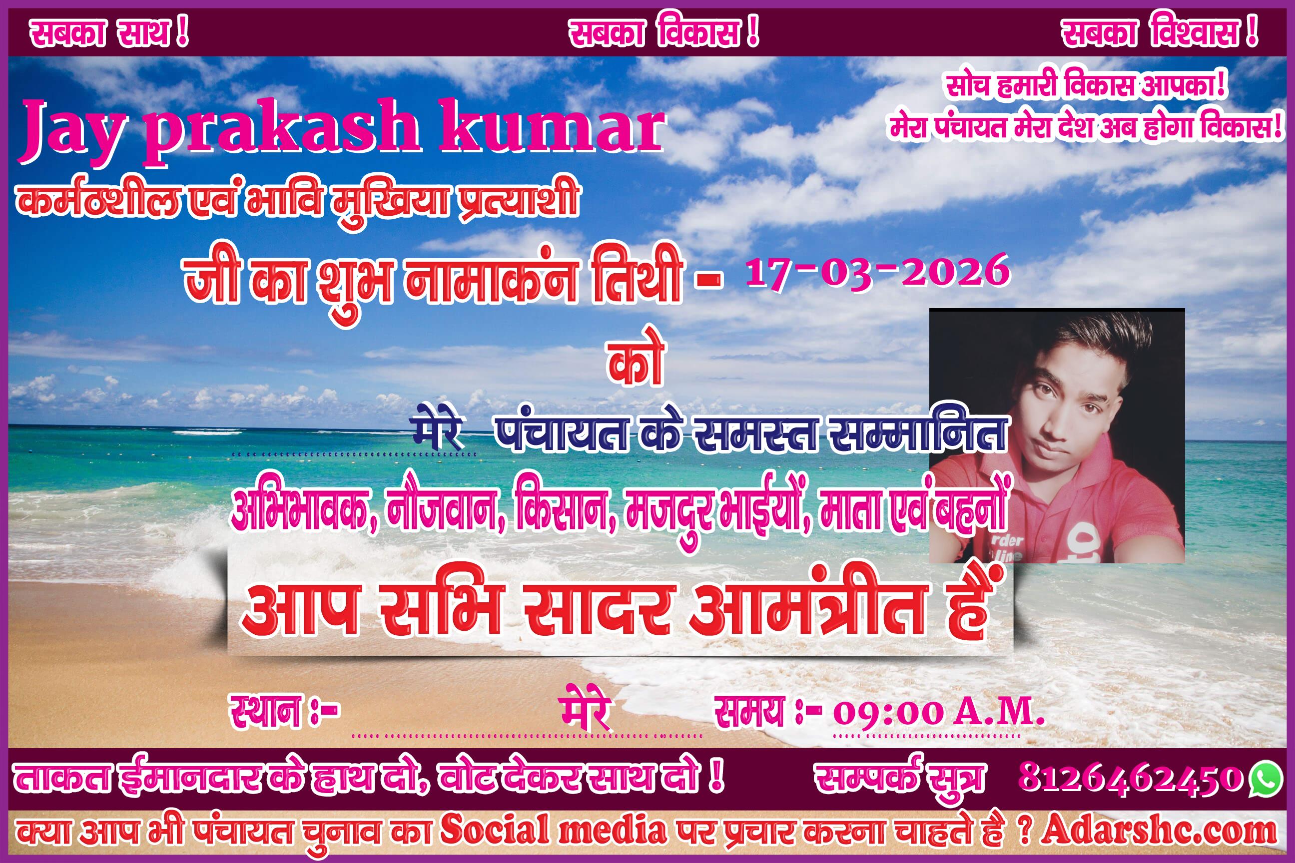 ♥ अगर आप भी पंचायत चुनाव में भाग लिये है ! तथा आप भी अपना ईस प्रकार से Social Media पर प्रचार कर अपने लोगों तक पहुँचना चाहते है, तो Sign up कर ID No. प्राप्त करे |