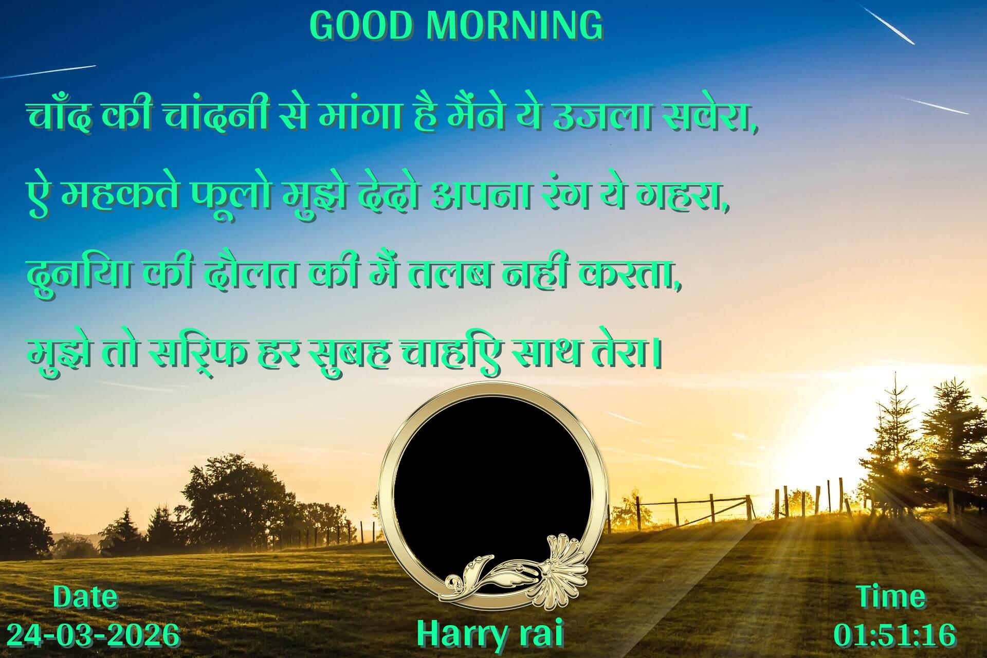 चाँद की चांदनी से मांगा है मैंने ये उजला सवेरा, ऐ महकते फूलो मुझे देदो अपना रंग ये गहरा, दुनिया की दौलत की मैं तलब नही करता, मुझे तो सिर्फ हर सुबह चाहिए साथ तेरा।