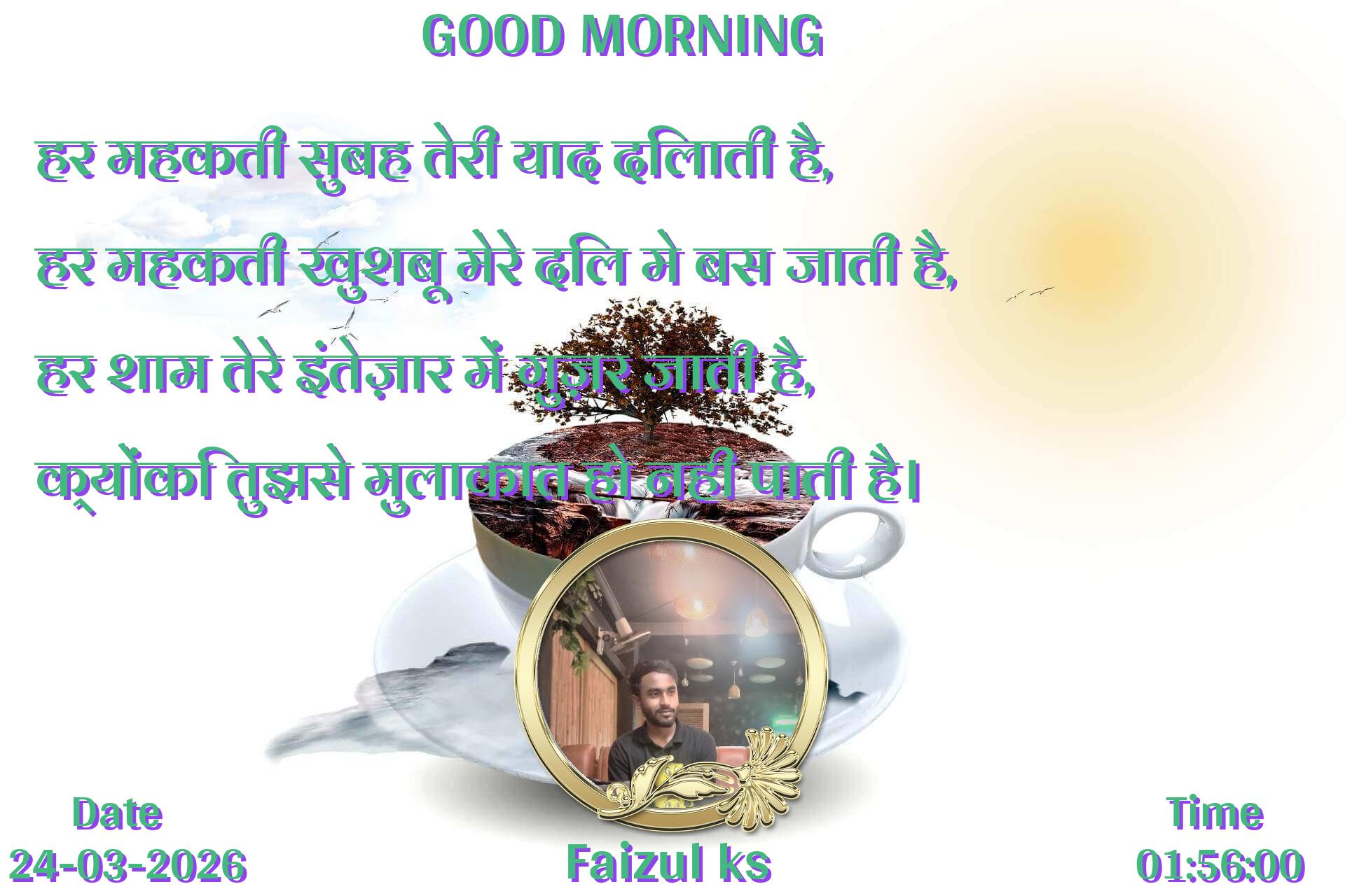 हर महकती सुबह तेरी याद दिलाती है, हर महकती खुशबू मेरे दिल मे बस जाती है, हर शाम तेरे इंतेज़ार में गुज़र जाती है, क्योंकि तुझसे मुलाकात हो नही पाती है।