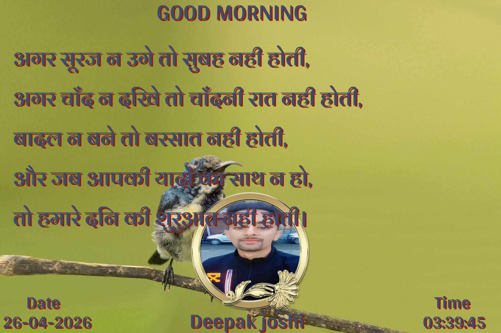 अगर सूरज न उगे तो सुबह नही होती, अगर चाँद न दिखे तो चाँदनी रात नही होती, बादल न बने तो बरसात नही होती, और जब आपकी यादों का साथ न हो, तो हमारे दिन की शुरुआत नही होती।