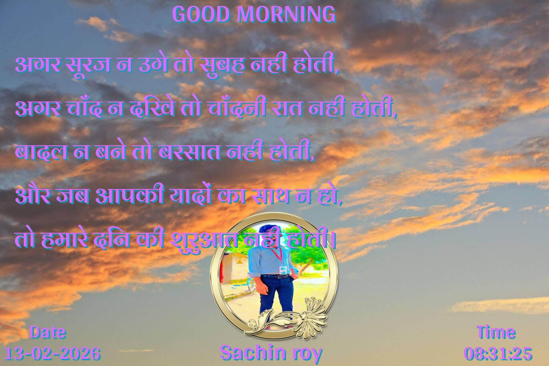 अगर सूरज न उगे तो सुबह नही होती, अगर चाँद न दिखे तो चाँदनी रात नही होती, बादल न बने तो बरसात नही होती, और जब आपकी यादों का साथ न हो, तो हमारे दिन की शुरुआत नही होती।