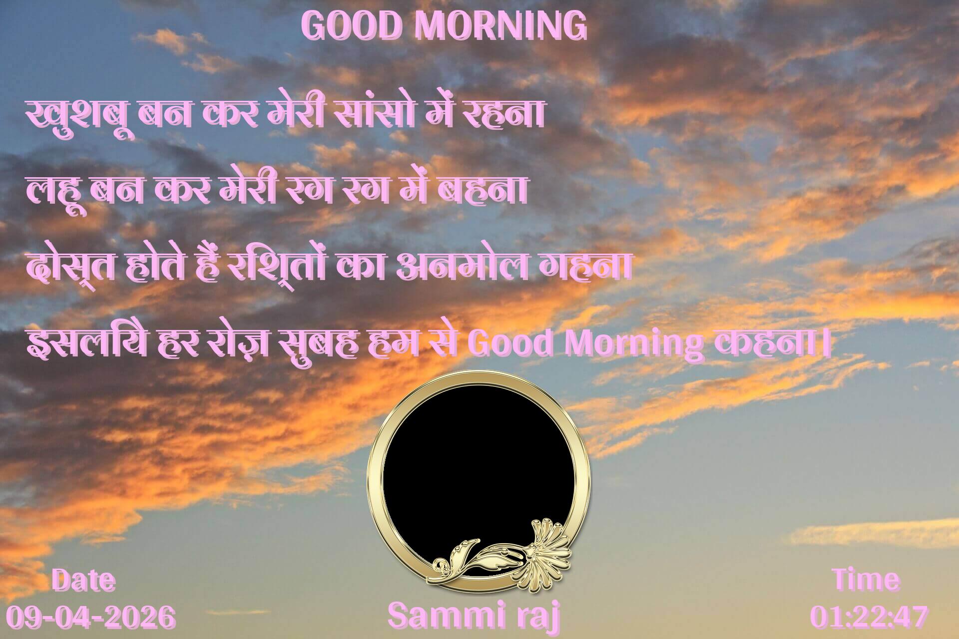 खुशबू बन कर मेरी सांसो में रहना लहू बन कर मेरी रग रग में बहना दोस्त होते हैं रिश्तों का अनमोल गहना इसलिये हर रोज़ सुबह हम से Good Morning कहना।