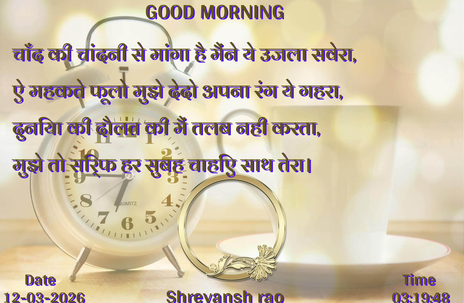 चाँद की चांदनी से मांगा है मैंने ये उजला सवेरा, ऐ महकते फूलो मुझे देदो अपना रंग ये गहरा, दुनिया की दौलत की मैं तलब नही करता, मुझे तो सिर्फ हर सुबह चाहिए साथ तेरा।