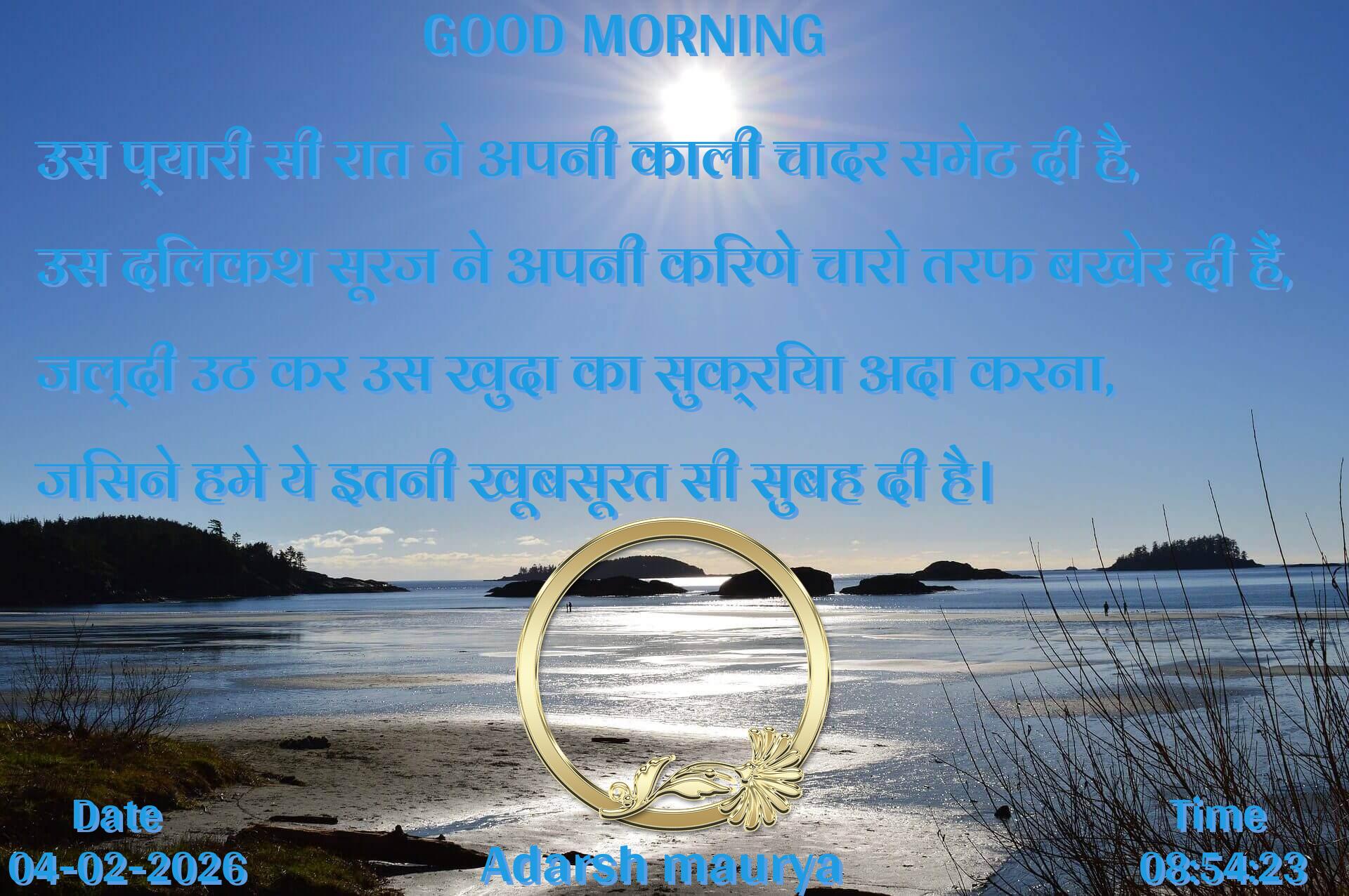 उस प्यारी सी रात ने अपनी काली चादर समेट दी है, उस दिलकश सूरज ने अपनी किरणे चारो तरफ बखेर दी हैं, जल्दी उठ कर उस खुदा का सुक्रिया अदा करना, जिसने हमे ये इतनी खूबसूरत सी सुबह दी है।
