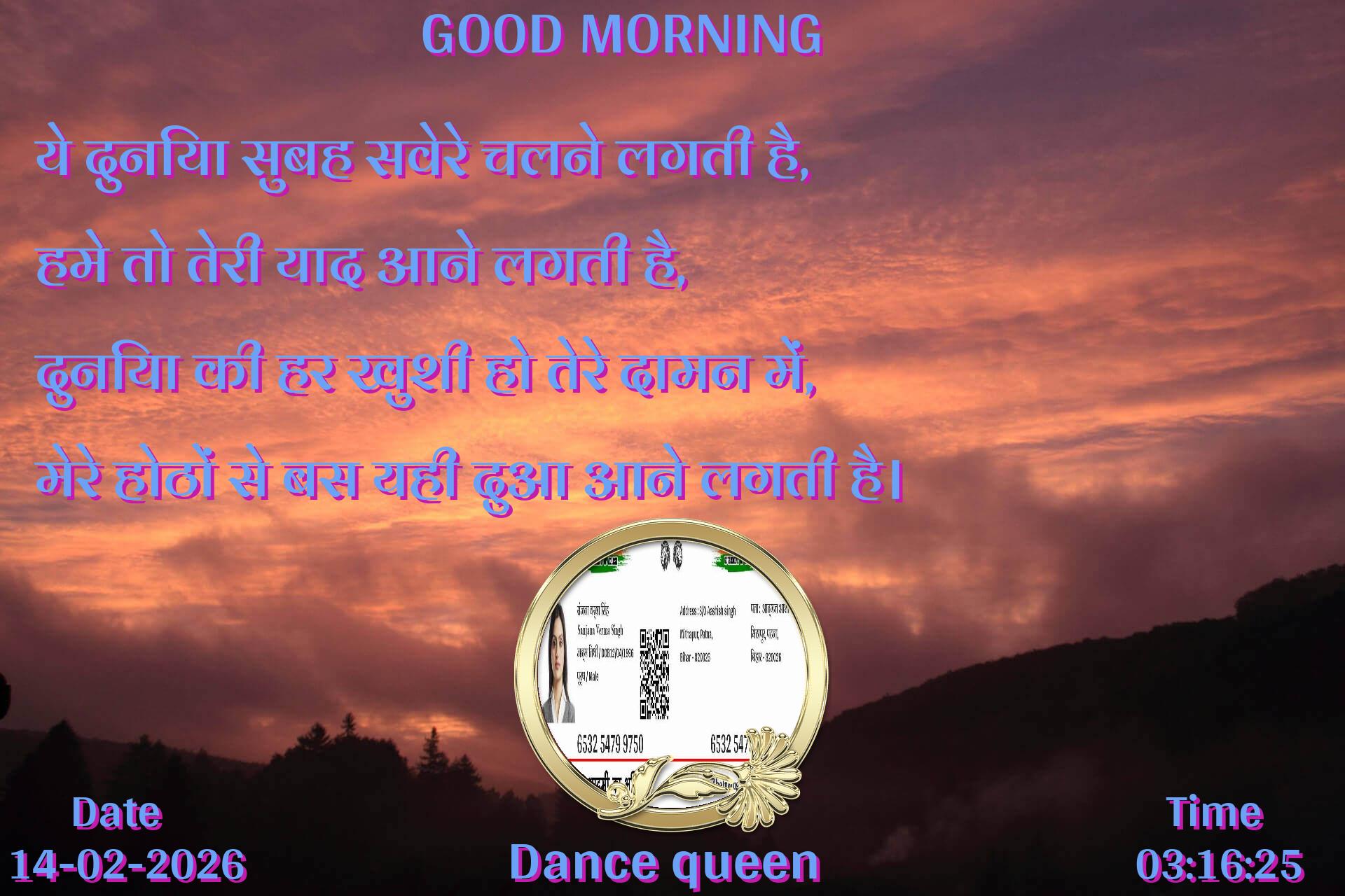 ये दुनिया सुबह सवेरे चलने लगती है, हमे तो तेरी याद आने लगती है, दुनिया की हर खुशी हो तेरे दामन में, मेरे होठों से बस यही दुआ आने लगती है।