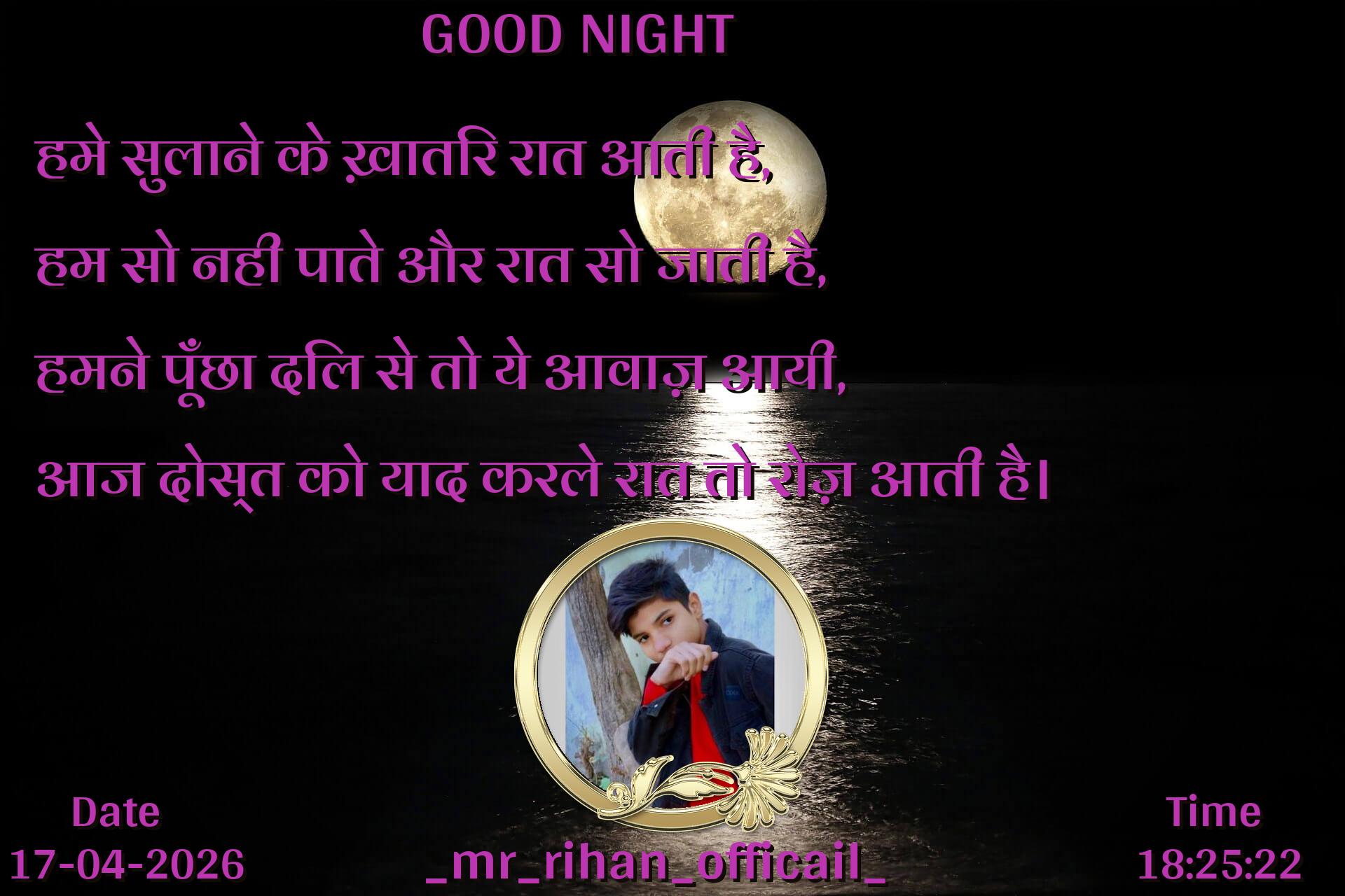 हमे सुलाने के ख़ातिर रात आती है, हम सो नही पाते और रात सो जाती है, हमने पूँछा दिल से तो ये आवाज़ आयी, आज दोस्त को याद करले रात तो रोज़ आती है।