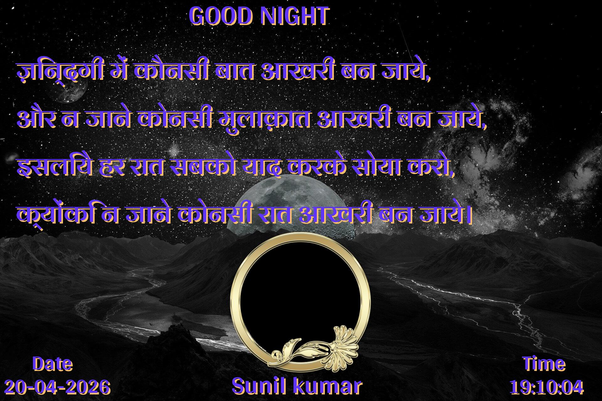 ज़िन्दगी में कौनसी बात आखरी बन जाये, और न जाने कोनसी मुलाक़ात आखरी बन जाये, इसलिये हर रात सबको याद करके सोया करो, क्योंकि न जाने कोनसी रात आखरी बन जाये।