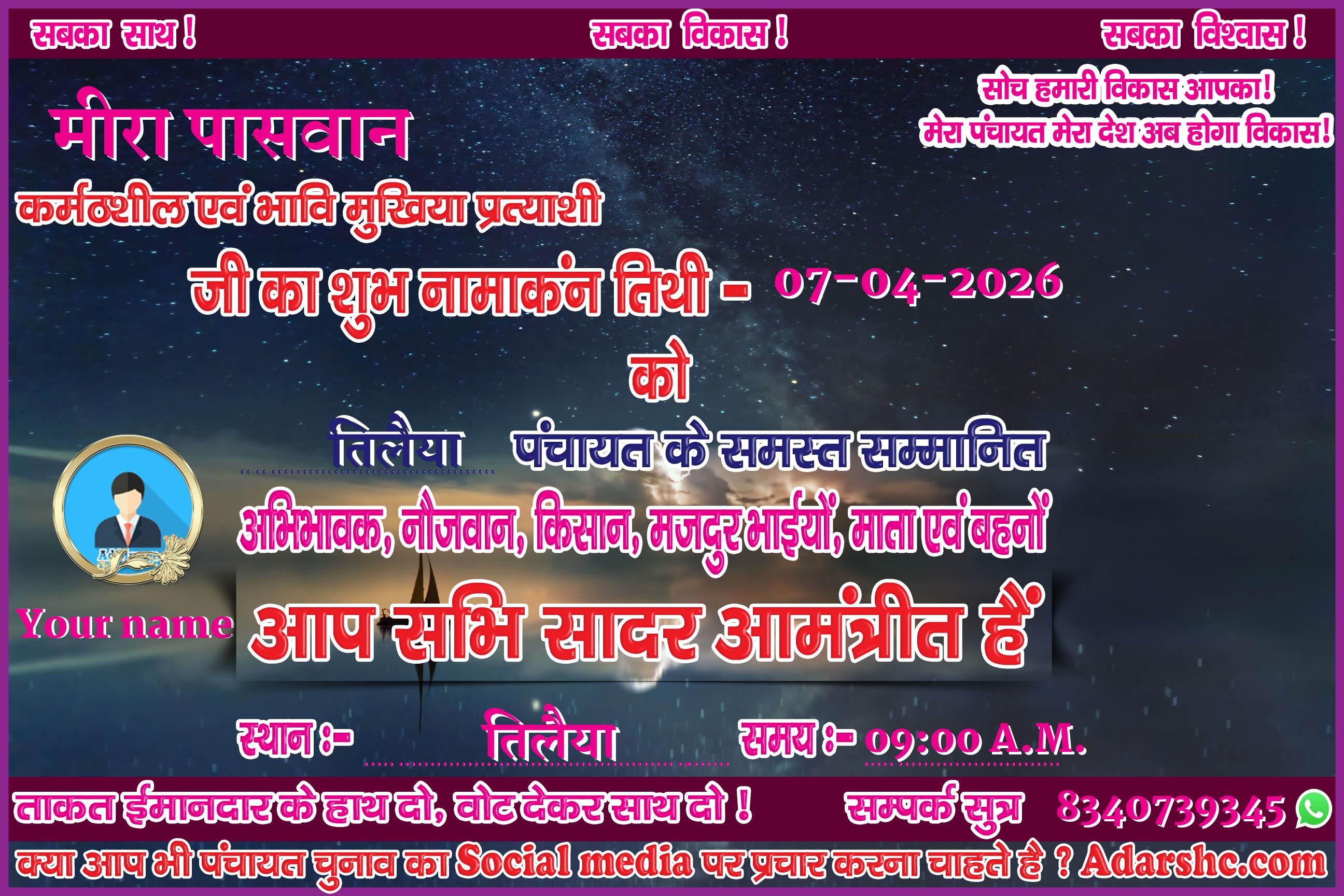 ♥ अगर आप भी पंचायत चुनाव में भाग लिये है ! तथा आप भी अपना ईस प्रकार से Social Media पर प्रचार कर अपने लोगों तक पहुँचना चाहते है, तो Sign up कर ID No. प्राप्त करे |