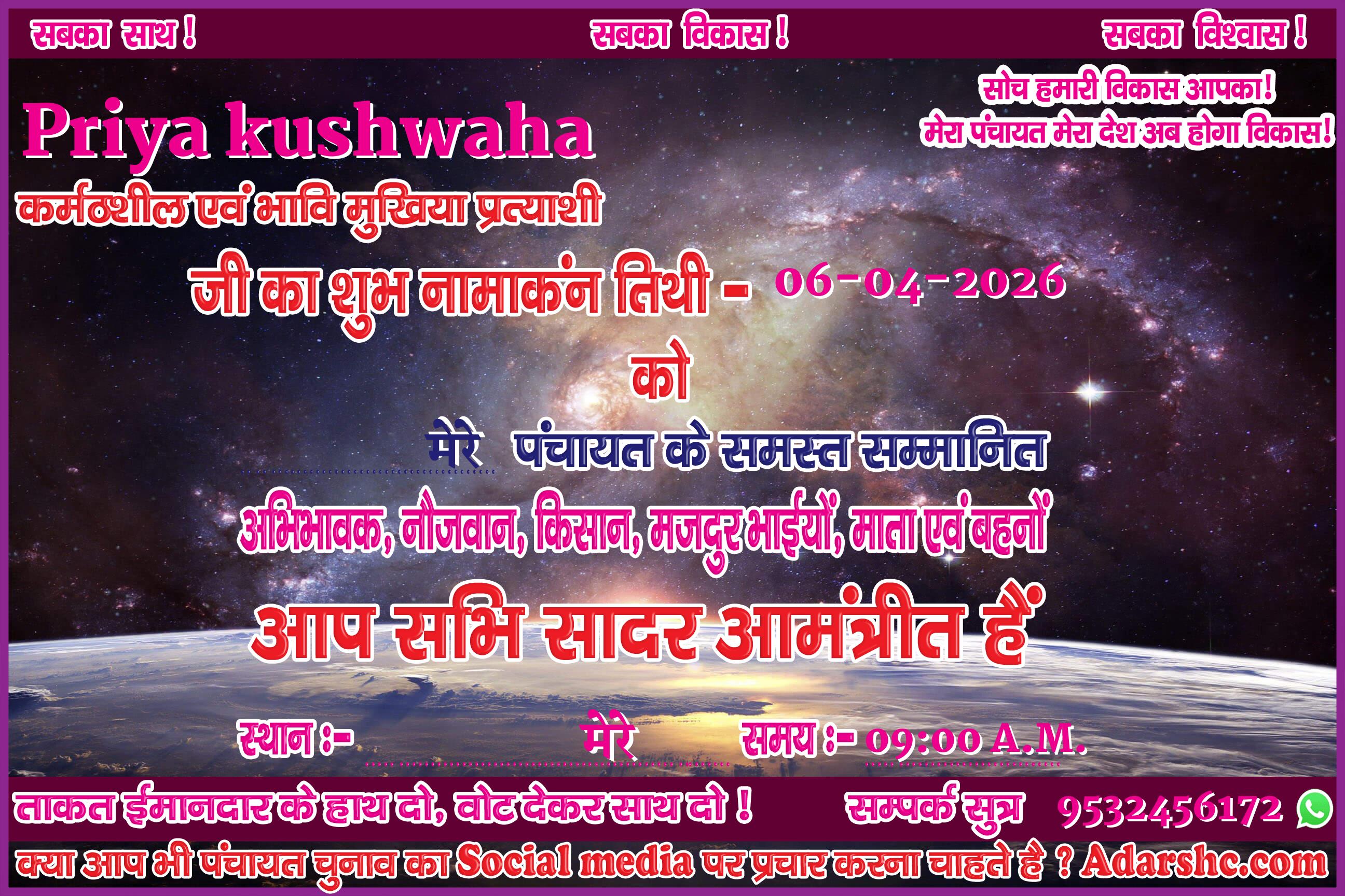 ♥ अगर आप भी पंचायत चुनाव में भाग लिये है ! तथा आप भी अपना ईस प्रकार से Social Media पर प्रचार कर अपने लोगों तक पहुँचना चाहते है, तो Sign up कर ID No. प्राप्त करे |