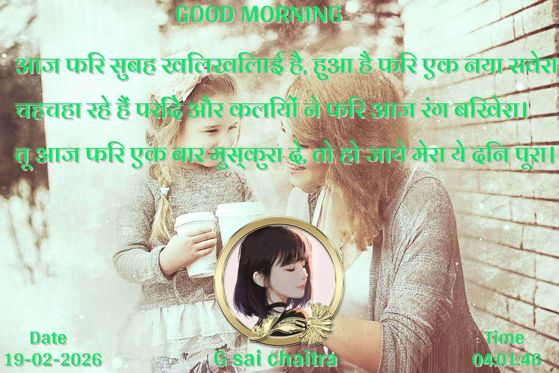 आज फिर सुबह खिलखिलाई है, हुआ है फिर एक नया सवेरा। चहचहा रहे हैं परिंदे और कलियों ने फिर आज रंग बिखेरा। तू आज फिर एक बार मुस्कुरा दे, तो हो जाये मेरा ये दिन पूरा।