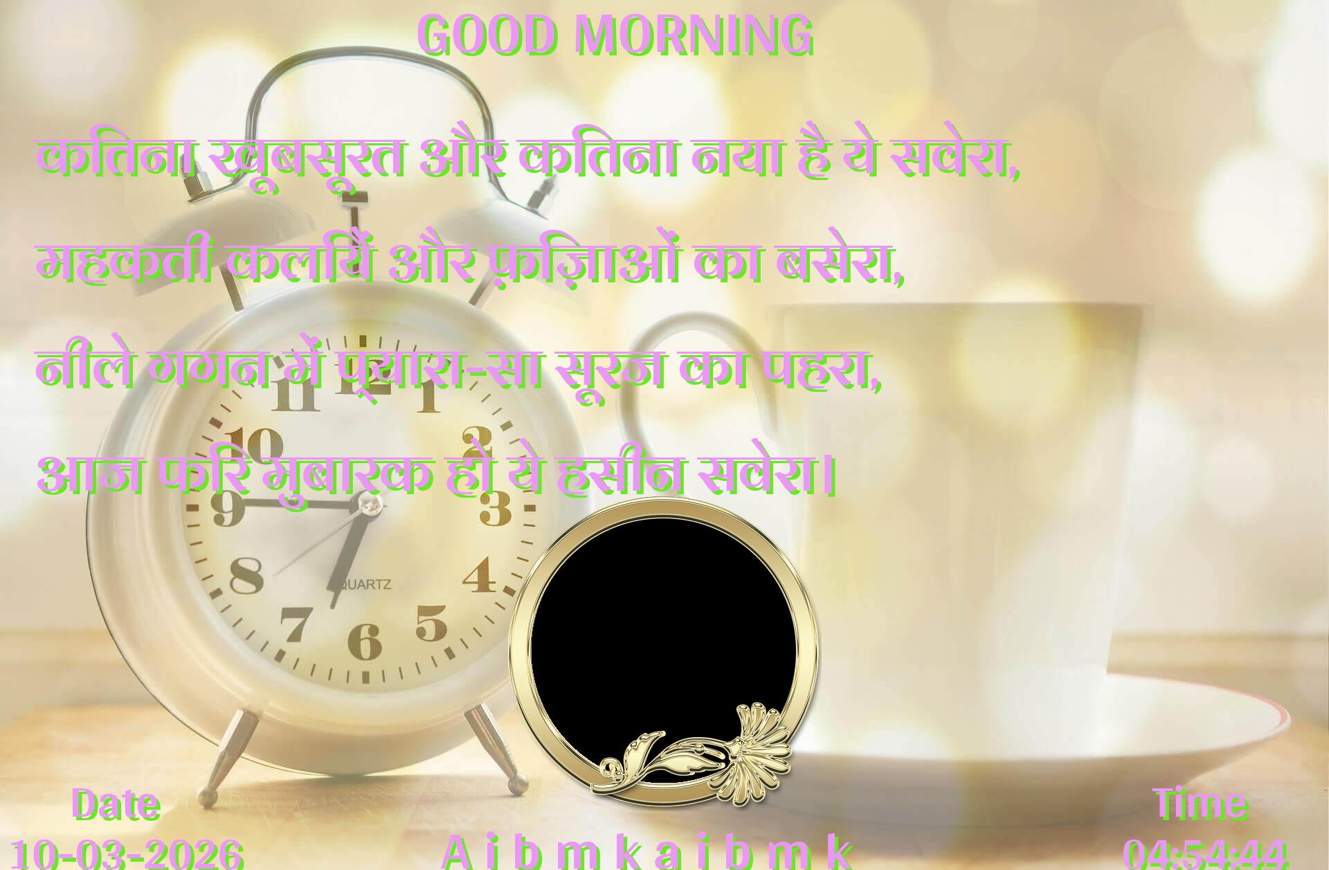 कितना खूबसूरत और कितना नया है ये सवेरा, महकती कलियें और फ़िज़ाओं का बसेरा, नीले गगन में प्यारा-सा सूरज का पहरा, आज फिर मुबारक हो ये हसीन सवेरा।
