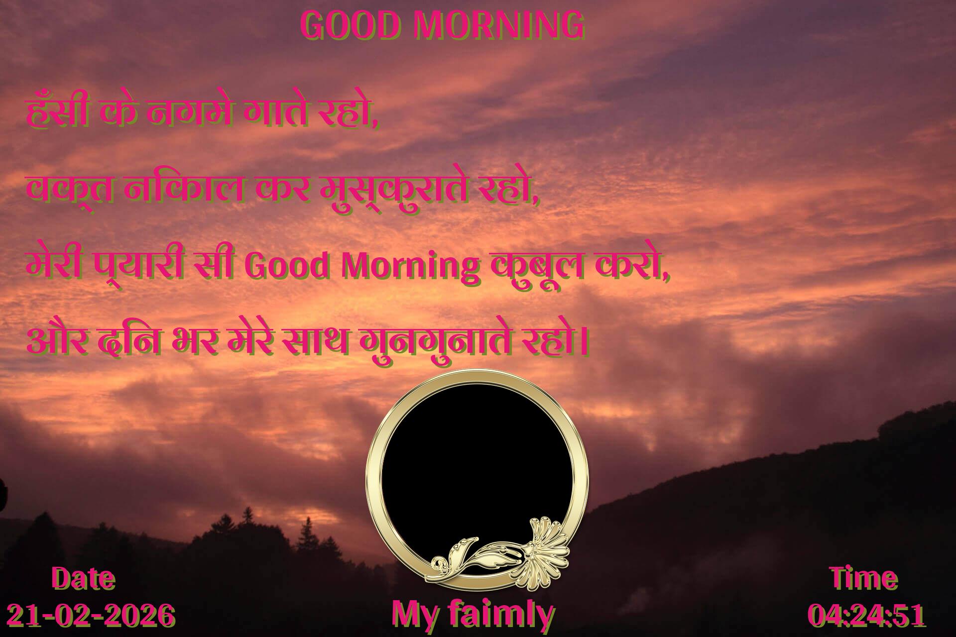 हँसी के नगमे गाते रहो, वक्त निकाल कर मुस्कुराते रहो, मेरी प्यारी सी Good Morning कुबूल करो, और दिन भर मेरे साथ गुनगुनाते रहो।