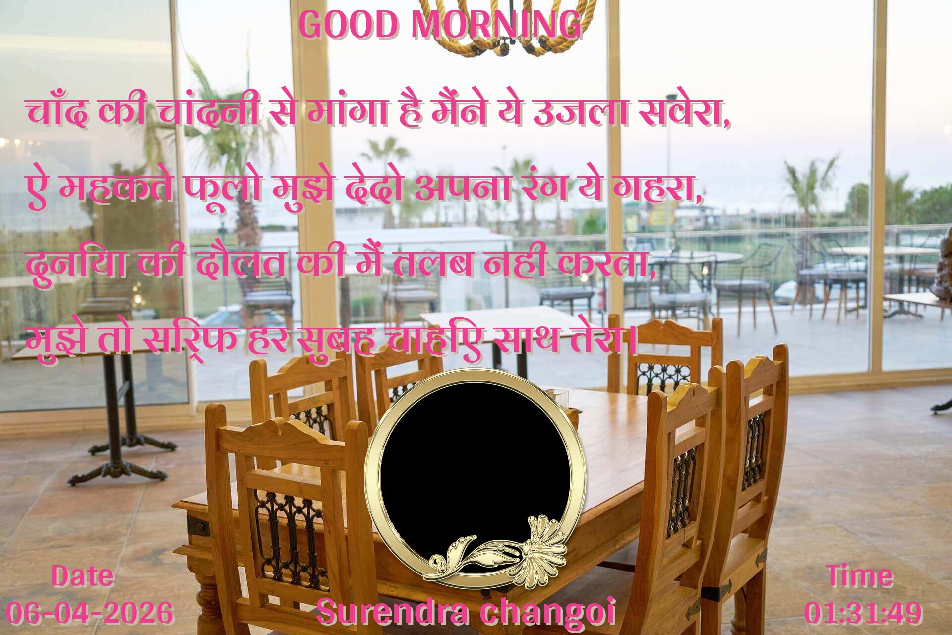 चाँद की चांदनी से मांगा है मैंने ये उजला सवेरा, ऐ महकते फूलो मुझे देदो अपना रंग ये गहरा, दुनिया की दौलत की मैं तलब नही करता, मुझे तो सिर्फ हर सुबह चाहिए साथ तेरा।