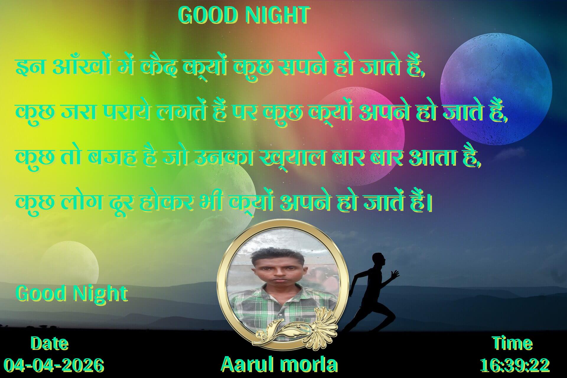इन आँखों में कैद क्यों कुछ सपने हो जाते हैं, कुछ जरा पराये लगतें हैं पर कुछ क्यों अपने हो जाते हैं, कुछ तो बजह है जो उनका ख्याल बार बार आता है, कुछ लोग दूर होकर भी क्यों अपने हो जातें हैं। Good Night