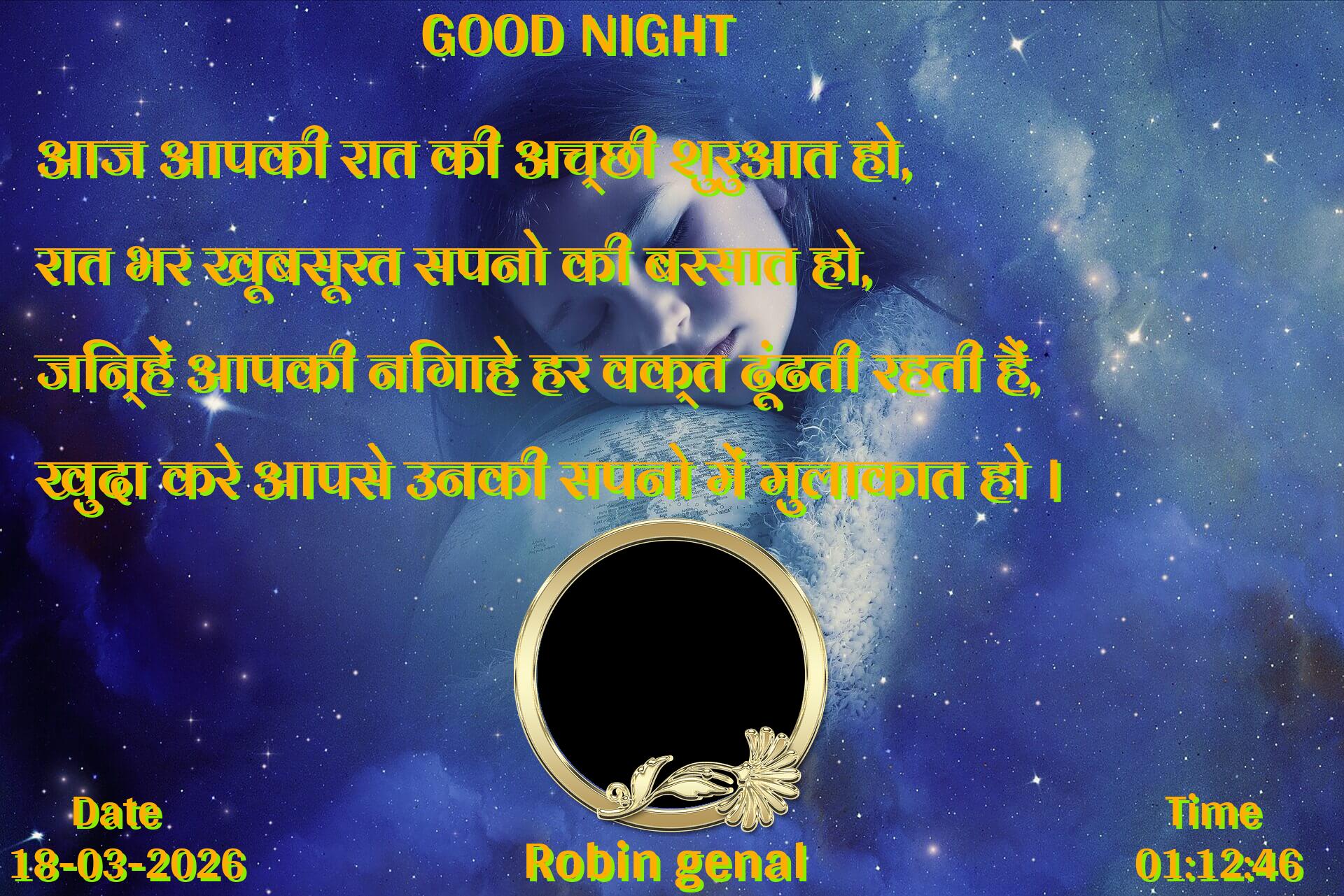 आज आपकी रात की अच्छी शुरुआत हो, रात भर खूबसूरत सपनो की बरसात हो, जिन्हें आपकी निगाहे हर वक्त ढूंढती रहती हैं, खुदा करे आपसे उनकी सपनो में मुलाकात हो ।