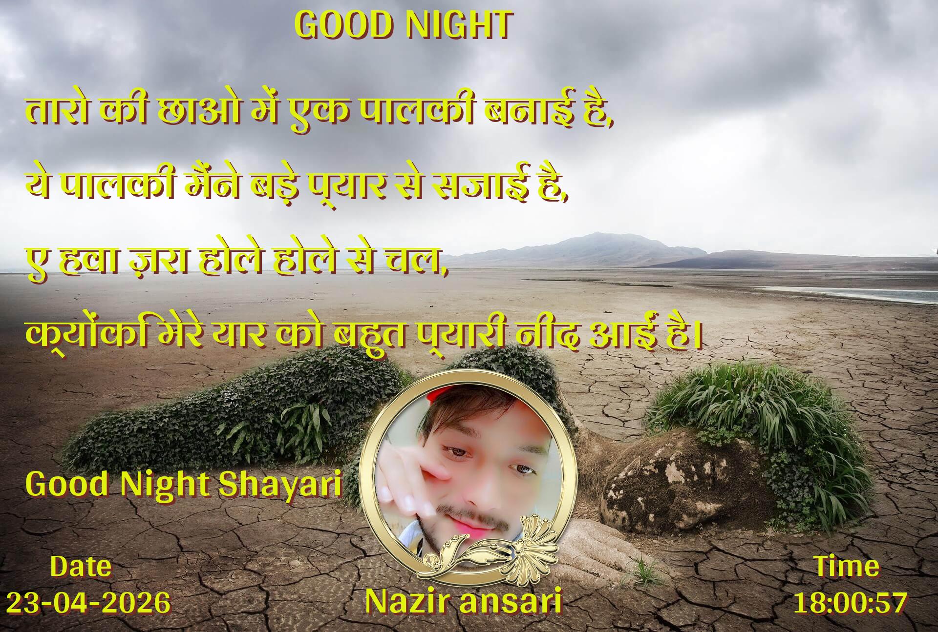 तारो की छाओ में एक पालकी बनाई है, ये पालकी मैंने बड़े प्यार से सजाई है, ए हवा ज़रा होले होले से चल, क्योंकि मेरे यार को बहुत प्यारी नींद आईं है। Good Night Shayari
