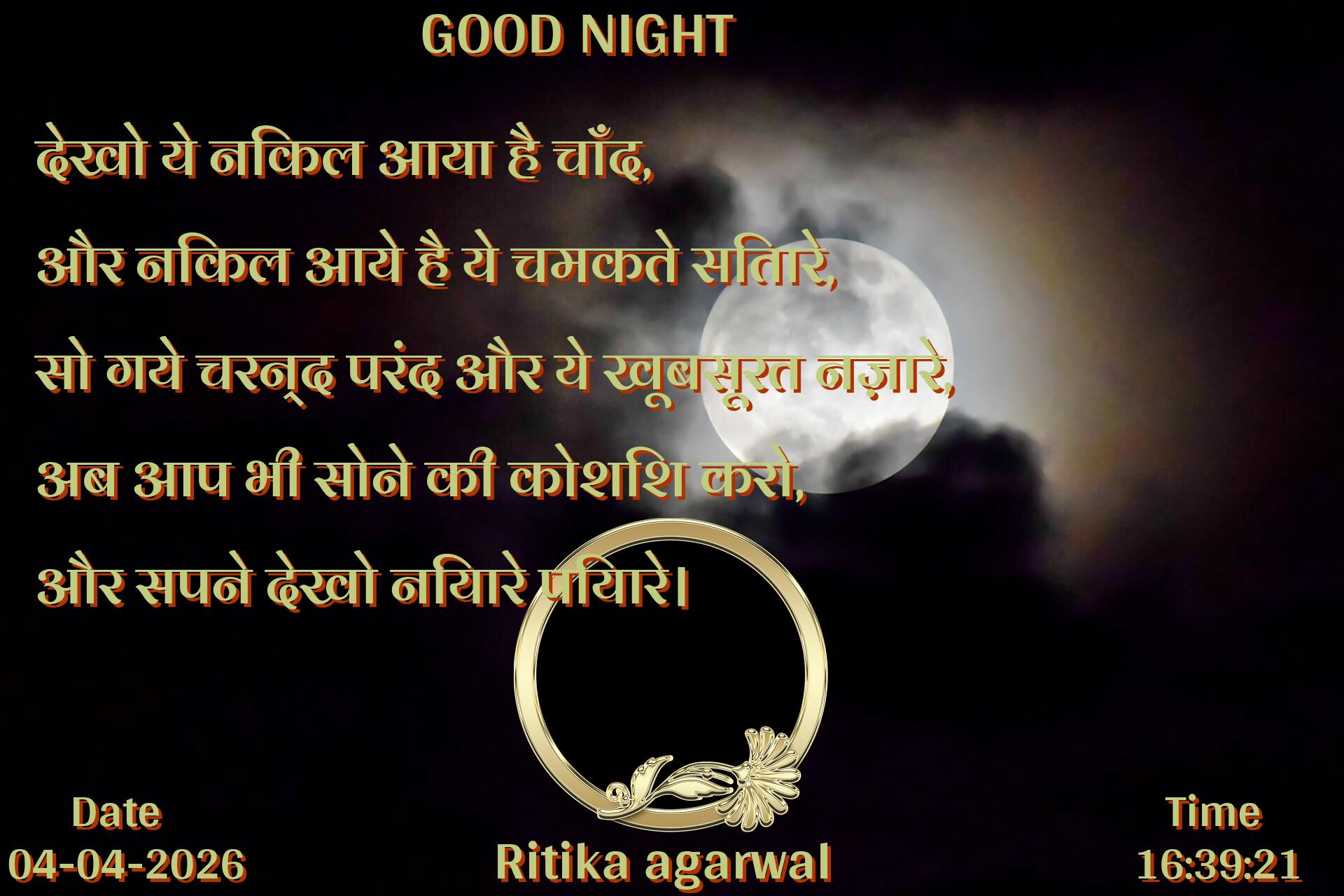 देखो ये निकल आया है चाँद, और निकल आये है ये चमकते सितारे, सो गये चरन्द परंद और ये खूबसूरत नज़ारे, अब आप भी सोने की कोशिश करो, और सपने देखो नियारे पियारे।